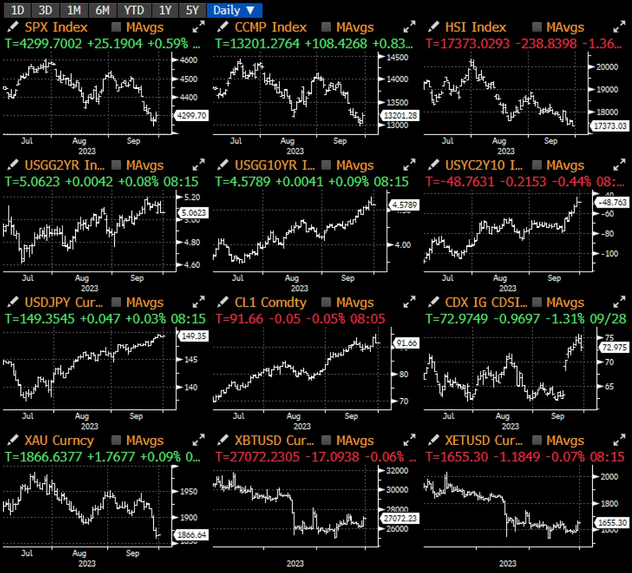 市场终于出现了部分小幅反弹,SPX 上涨约 0.6% ,Nasdaq 上涨近 1% ;债券收益率出现牛陡走势, 2 年期收益率上涨 6.5 个基点,而 5 年期 CDS 则收紧约 5 个基点,美元兑日圆稳定保持在略低于 150 的水平。