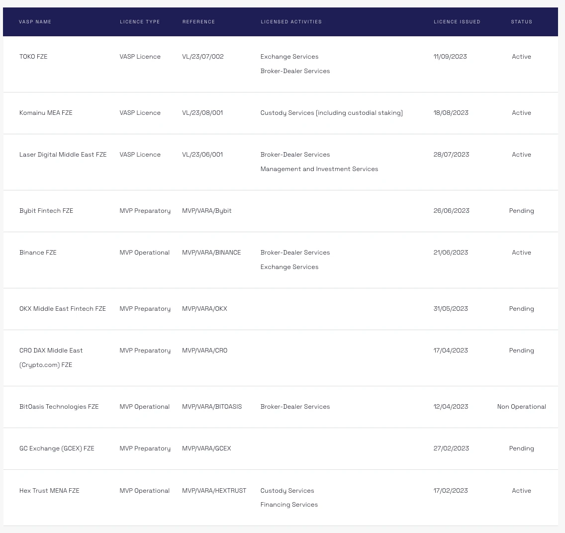 VARA 确定了七种不同的虚拟资产(*VA)活动,涵盖咨询服务、经纪自营商服务、托管服务、兑换服务、借贷服务、管理及投资服务、转账结算服务。许可流程分为四个阶段:临时许可、准备和运营最小可行产品(*MVP)许可以及所谓的完全市场产品(*FMP)许可,在阶段性( 4) FMP 许可证批准之前”,MVP 许可证持有者不可向大众零售消费者提供服务(*允许向迪拜符合条件的散户和机构投资者提供相关虚拟资产服务)。当前,有三家公司正式取得了相关许可活动的 VASP 牌照,币安、 OKX 、Bybit 等处于 MVP 的不同阶段。