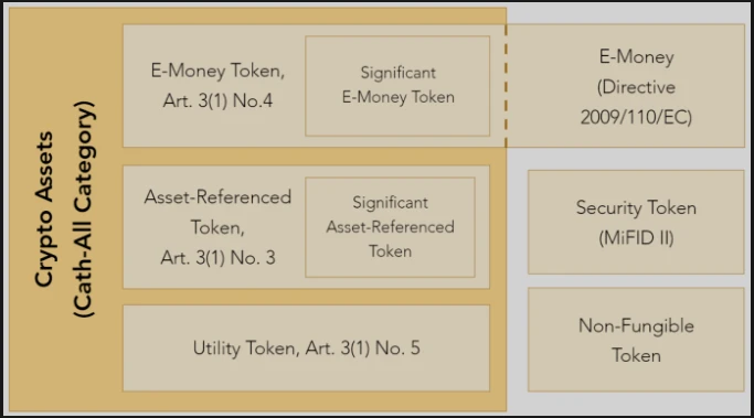 MiCA 将加密资产定义为:使用分布式账本技术或类似技术以电子方式转移和存储的价值或权利的数字表示形式。在加密资产分类方面,MiCA 将资产分为电子货币代币、资产参考代币和二者之外的加密资产,其中电子货币是指通过参考一种官方货币的价值来维持稳定价值的加密资产,主要涉及法规第四章;资产参考代币是指非电子货币代币的加密资产,旨在通过参考另一种价值、权利或组合来维持稳定的价值,包括一种或多种官方货币,主要涉及法规第三章;实用代币是指仅用于提供对发行人提供的商品或服务访问权限的一种加密资产,主要涉及法规第五章。根据现有法案,MiCA 并未对证券类代币和 NFT 给出明确的监管方法,对当前加密市场已有代币的具体划分也需要更多的实际用例来进行解释。
