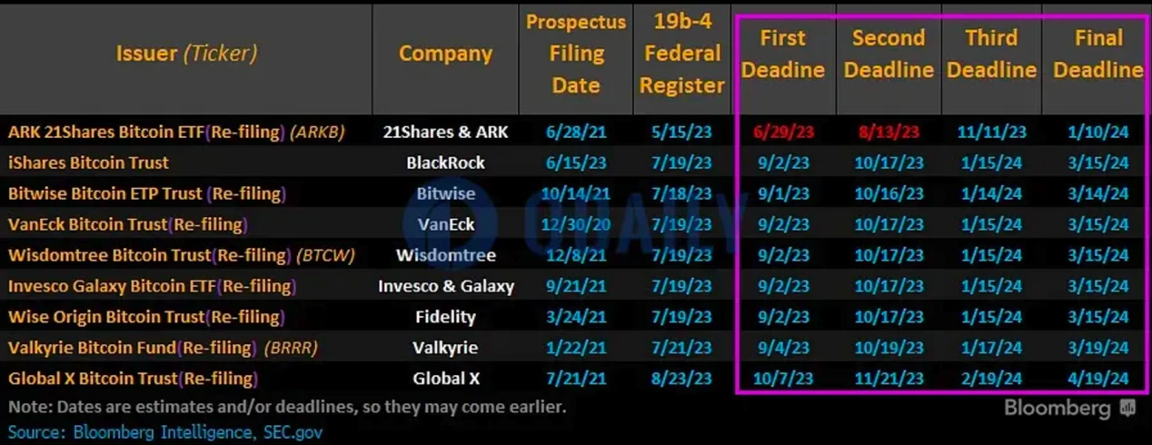 目前已有多家美国基金巨头提交了比特币现货 ETF 的申请,包括贝莱德、富达、ARK、 Bitwise 、 WisdomTree 、 Valkyrie 等,SEC 需要在四个 Deadline 之前对申请文件做出回应(*包括拒绝、批准或推迟)。SEC 在第一个 Deadline 时没有批准任何的申请通过,在 10 月中旬将会将会迎来很多申请的第二个时间节点做出相关决定。