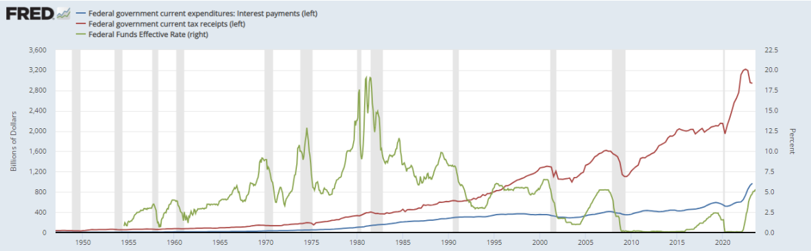再看美国,超过 7 万亿美元的债务将在明年到期。美联储可能不得不购买大量此类债务,因为它们需要再融资。此外,债务利息支付目前占税收收入的 31% 以上(红线)——税收收入正在下降,表明经济衰退即将来临(灰线)。如何增加税收收入? 降低利率(绿线)。
