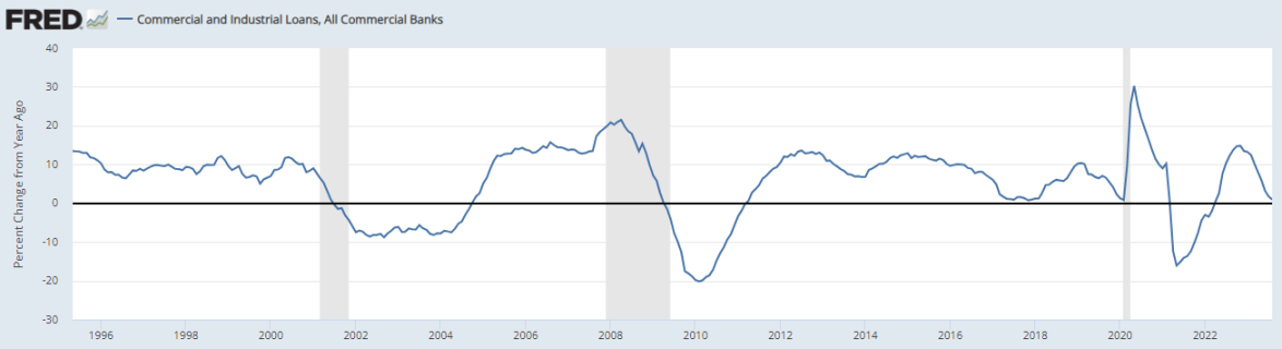 美国商业银行贷款目前处于衰退水平(灰线 = 衰退):
