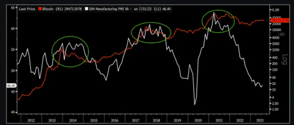 此外,对比美国 ISM 制造业 PMI 指数(注:美国供应管理协会 (ISM) 制造业采购经理人指数 (PMI),显示了指定月份美国制造业的商业环境。该指数是基于对美国 18 个行业的数百家企业的代表进行的调查计算得出),会发现加密市场的每个周期几乎都与经济周期的周期性变化完全一致。