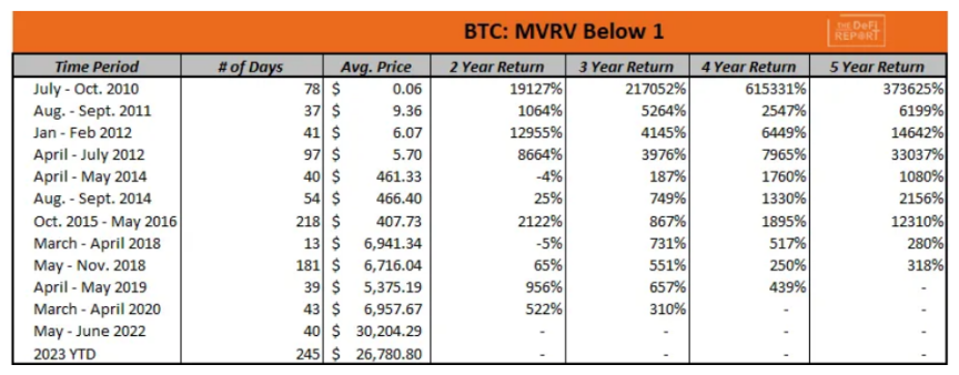 从历史上看,长线投资者只要在 MVRV 信号低于 1 的时候入市,就能赚得盆满钵满。
