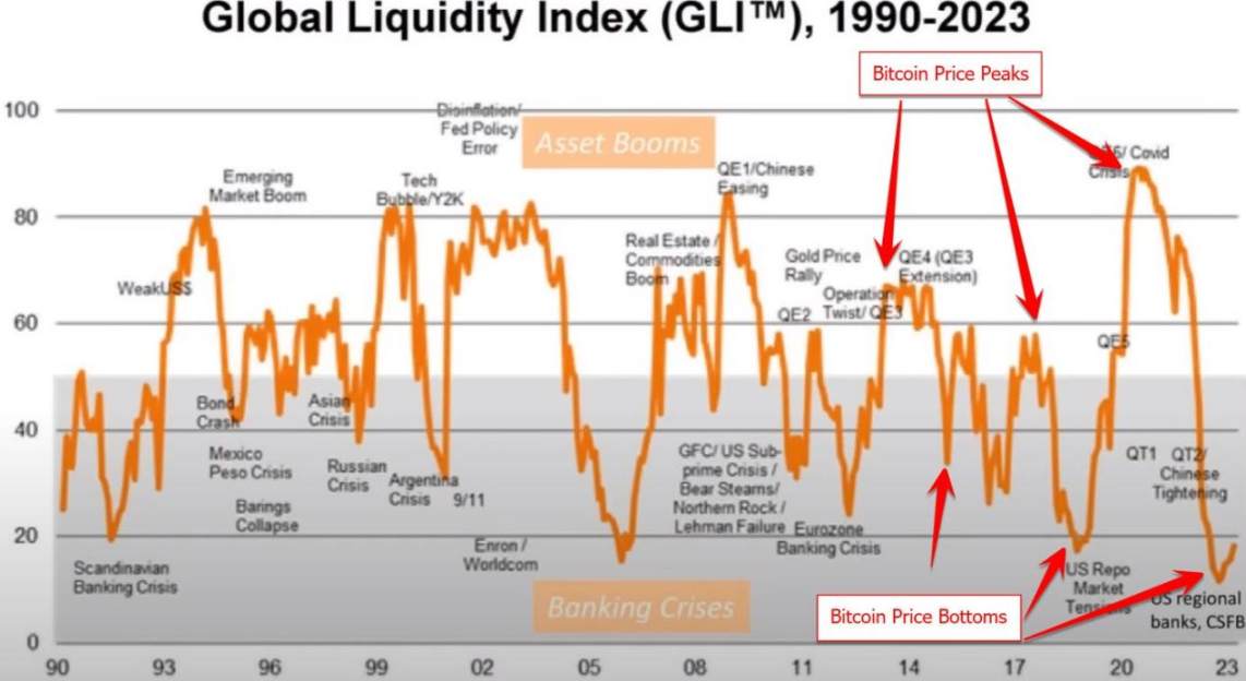 作者认为全球流动性已于 2022 年 10 月触底。从那时起,可以看到美联储实施了一轮隐形量化宽松(与三月份的银行业危机有关)。现在中国正在与通货紧缩作斗争。