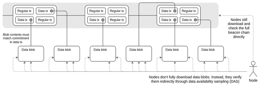 EIP-4844 引入的带 blob 交易的示意图概述。请注意, DAS 直到完全的 Danksharding 才可用。