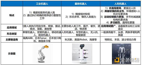 人形机器人概念股备受青睐,要从整个机器人产业链说起,机器人主要分为三类:工业机器人、服务机器人、人形机器人。其中,工业机器人主要通过明确的程序进行高精度的重复性工作,如汽车装配的代表企业是德国的库卡,服务机器人则是模仿人类能力,进行进度较低的工作,如扫地机器人,代表企业是科沃斯。