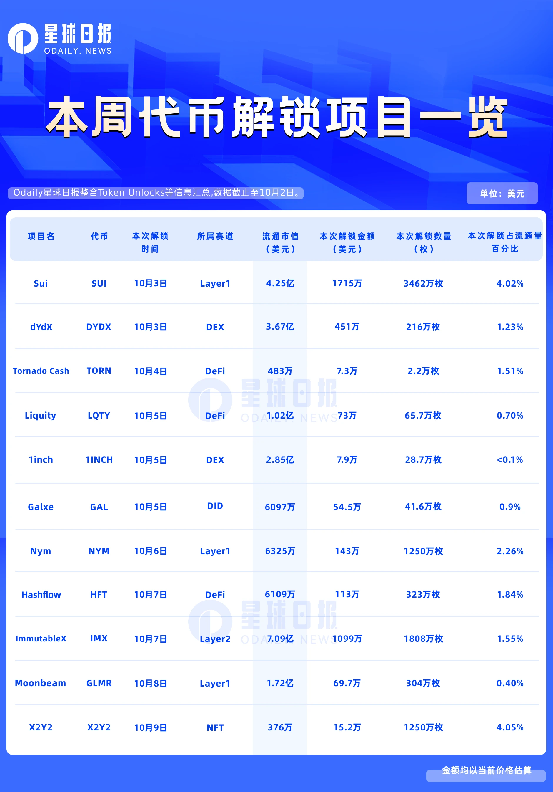 一周代币解锁预告:SUI、IMX千万美元级大额解锁,11项目周内解锁