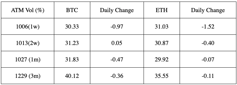 隐含波动率方面,期权 ATM IV 今日小幅下滑,BTC/ETH 中前端 IV 下降 0.5 ~ 1.5% 左右,后端轻微下跌 0.1 ~ 0.4% ,BTC 曲线变得更陡,ETH 前端仍维持着上翘的状态。