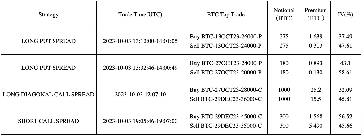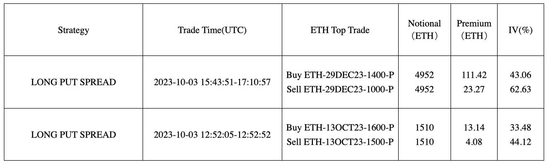 从交易方面看,过去 24 H 市场看跌期权交易比例明显升高,带有看跌保护性质的 Long Put Spread 占据了市场主导地位。交易员在 BTC 的 13 OCT/27 OCT 以及 ETH 29 DEC 等期限上分批买入 Put Spread,总数量达到 4156 BTC/ 15424 ETH。