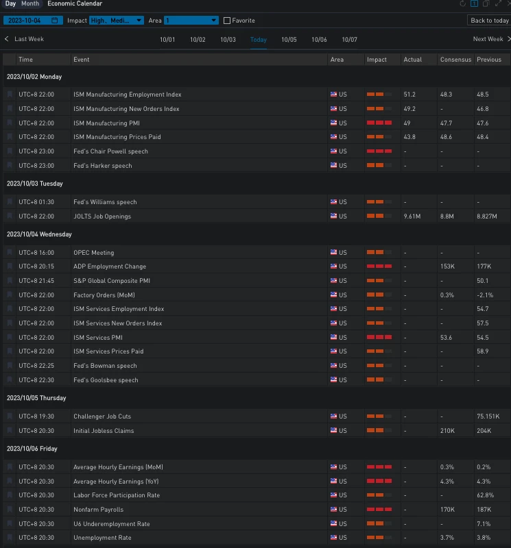 今晚市场将重点关注美国 9 月 ADP 就业人数(4 Oct 08: 15 pm UTC+ 8)变动及 ISM 非制造业指数(4 Oct 10: 00 pm UTC+ 8)数据发布。
