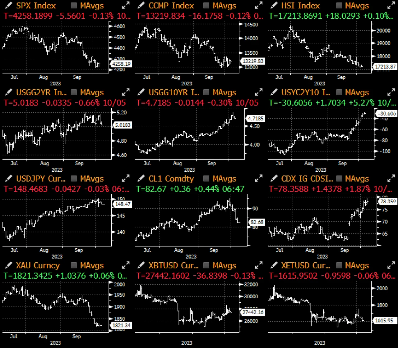 此后,风险市场有所回稳, 9 月 ADP 就业人数增长大幅放缓(+ 8.9 万,低于预期的 + 15.8 万),欧元区零售销售数据低于预期(环比 -1.2% vs 预期 -0.5% ),花旗美国信用卡数据下滑(9 月前两周环比 -1.3% ),加上原油期货走跌 12% ,帮助债券暂时止住了跌势,然而,与过去 24 个月由美联储(政策紧缩)驱动的下跌不同,目前的收益率变动是熊陡走势所推动, 2/10 s 曲线逆转回到一年多来未见的水平,尽管美联储的加息已接近尾声,但考虑到通胀压力将长期存在, 15 年来的零利率/量化宽松过剩被迅速修正,投资者现在要求更高的收益率溢价和贴现率。