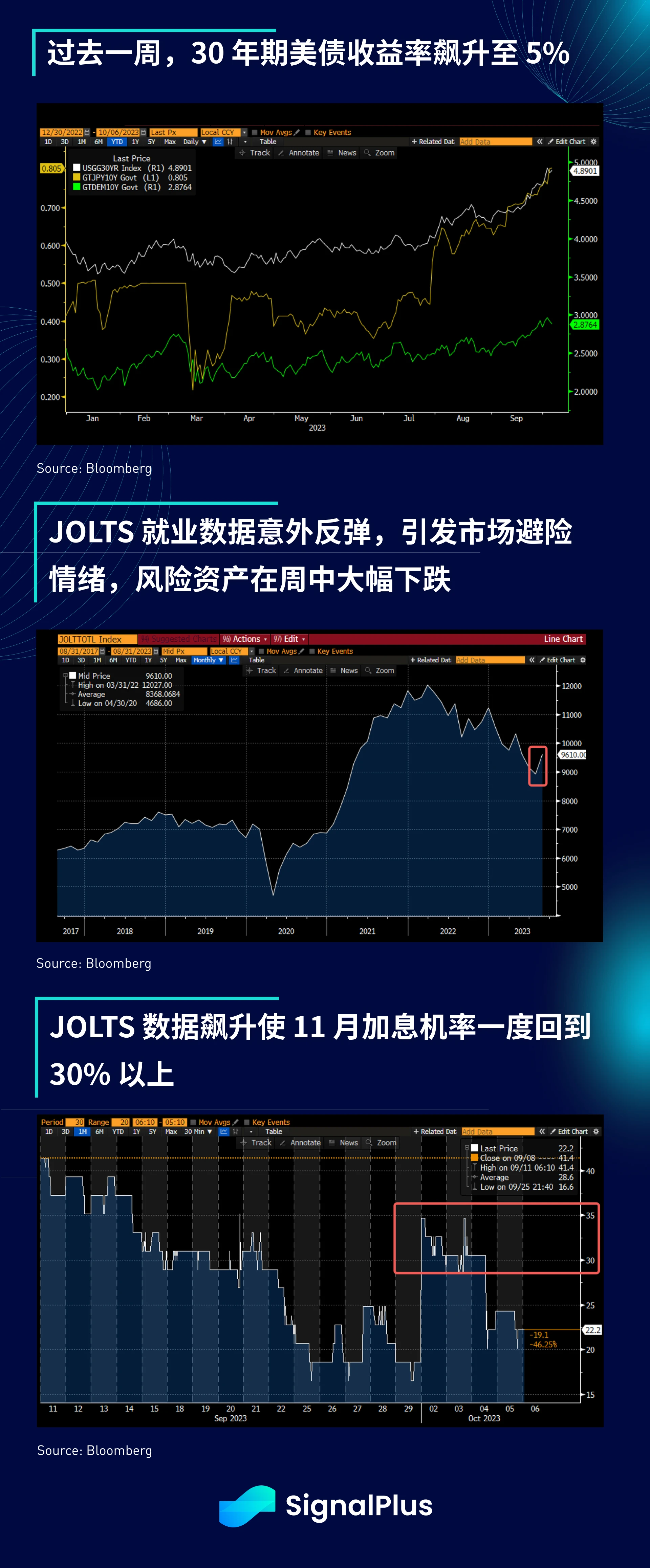 本周,中国和香港仍在黄金周假期中,宏观方面最大的消息是全球收益率的飙升,其中 30 年期美债收益率触及 5% , 10 年期德国公债收益率触及 3% , 10 年期日本公债收益率也超过 80 个基点。