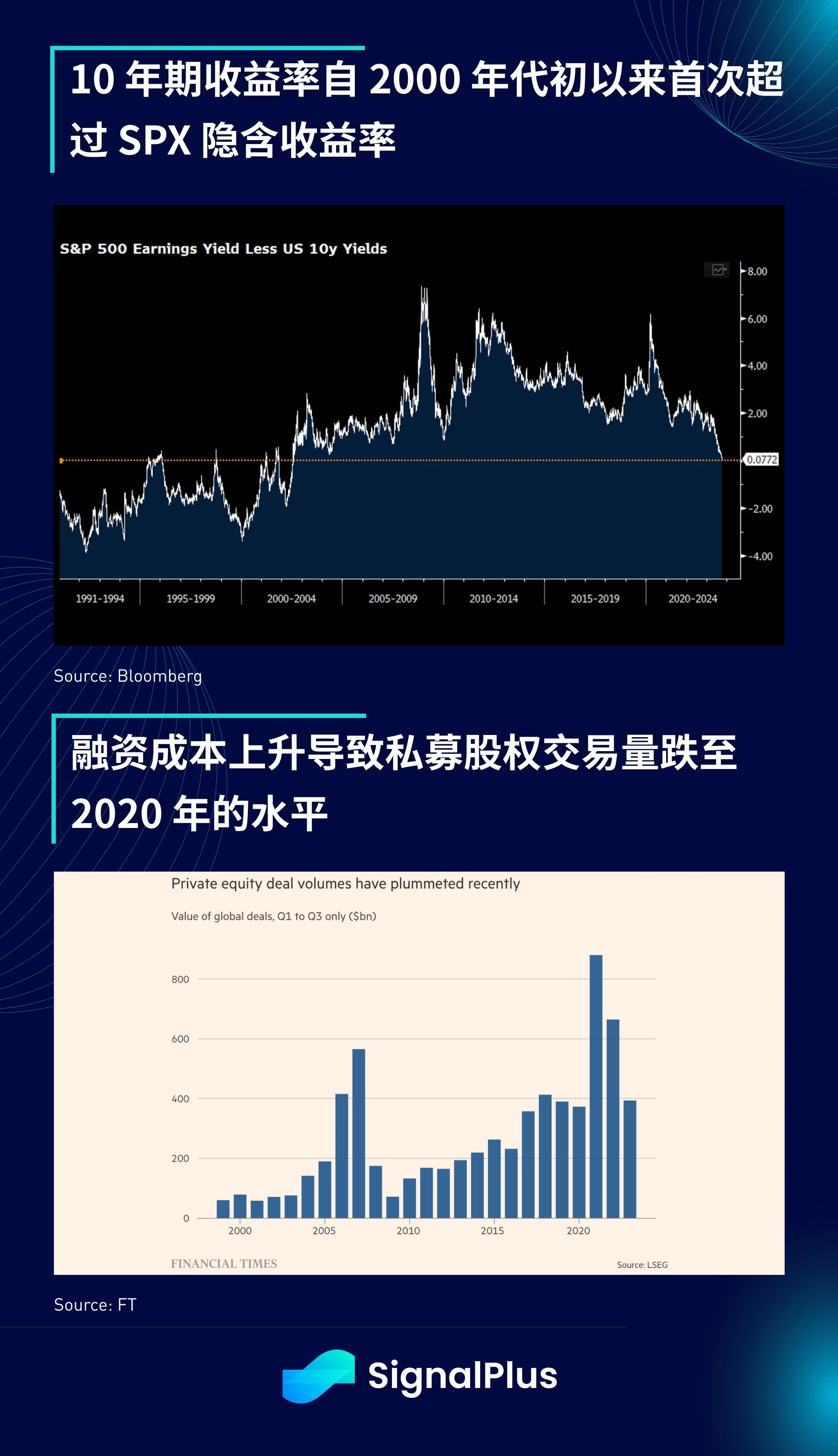 高融资利率的回归将对宏观资产产生深远的影响,年轻投资者正进入一个以前从未想像过的「无风险利率 5% 」的世界;利率上升导致投资组合损失的担忧使得银行股价在过去一个月下跌了近 9% ,银行持有至到期投资组合的帐面损失估计接近 4000 亿美元,而 10 年期债券收益率自 2000 年代初以来首次超过 SPX 隐含收益率,即使是曾经炙手可热的私募股权领域,从已执行的交易量来看,也已暴跌至 2020 年的水平,融资利率的飙升在可预见的未来严重限制了融资选择和退出假设。