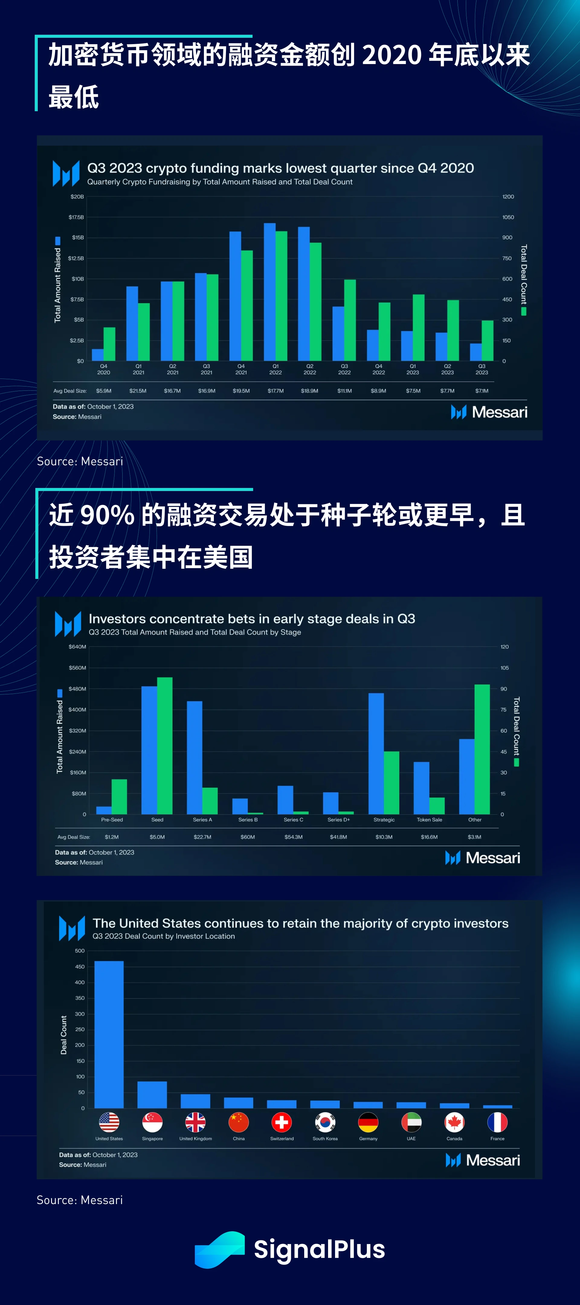 不出所料,资本的压力已蔓延至加密货币领域,该行业的融资金额创下 2020 年底以来的最低水平,此外,估值和如何退出重新成为重点,约 90% 的融资交易都处于种子轮融资阶段或更早,而尽管存在监管阻力,投资者仍主要来自美国。