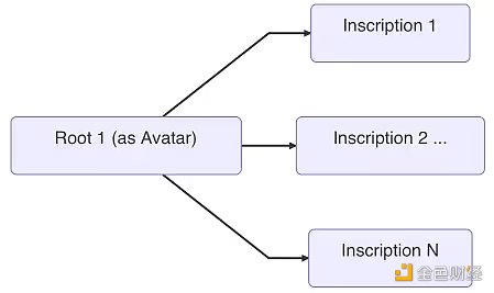 Ordinals 的创建者 Casey Roadamor 没有将出处与比特币钱包地址联系起来,这包括隐私权衡和缺乏定制性,而是构想了根铭文的想法,它将充当未来作品的头像或徽标。根铭文是“父母”,未来的铭文,即“孩子”,可以链接回父母。实际上,其工作方式是将根铭文的聪作为揭示交易的输入。当提交交易创建的输出被花费时,它会在链上显示铭文内容,这称为显示交易。通过这种起源风格,创建了一个谱系树,如下图所示: