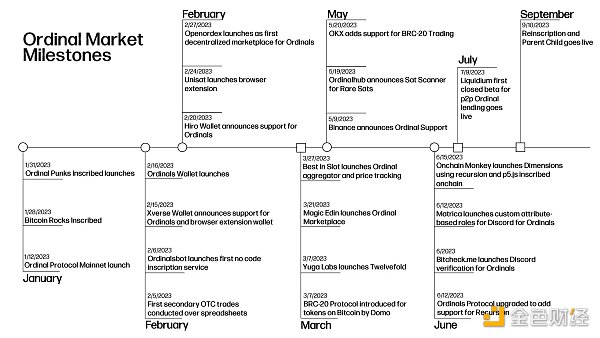 经过大约 8 个月的 Ordinals 开发,比特币开发人员已经构建了与其他主要 Layer-1 区块链(如以太坊、Polygon 和 Solana)上的 NFT 工具相当的 NFT 工具。有几家公司正在积极致力于秘密构建和改进 Ordinals 基础设施。以下是综合了过去 9 个月 Ordinals 领域许多市场里程碑的时间表: