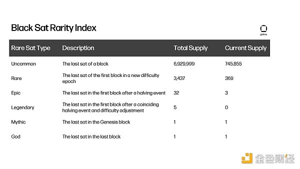 黑卫星(Black Sats)。 黑色 Satoshi 遵循 Rodamor 稀有指数,但不是一个区块的第一个 Satoshi,而是一个区块中铸造的最后一个 Satoshi。黑色卫星的想法是由@blackxbtx 创建的。