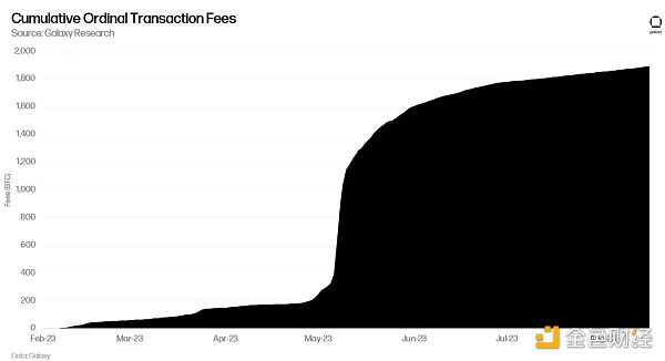 Ordinals 生态系统在其最初 200 天的活动中看到了令人印象深刻的用户参与度。在此期间,比特币用户铸造(即刻录)了 114 万件数字文物。考虑到 Ordinals 是在加密货币熊市期间推出的,Ordinals 的快速增长值得注意。2023 年上半年,蓝筹藏品的 NFT 数量和底价迅速下降。尽管更广泛的 NFT 市场正在努力摆脱熊市, 但 Ordinals 已经获得了巨大的关注,并且比特币数字文物的想法也蓬勃发展。