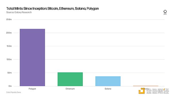 以太坊的 NFT 铸造活动于 2015 年 8 月随着 Terra Nullius NFT 系列的推出而开始。Polygon 上的第一个 NFT 铸造记录于 2020 年 5 月,Solana 上的第一个铸造记录于 2020 年 10 月。NFT 铸造活动在2021 年夏天之前就开始在以太坊、Solana 和 Polygon 上进行,当时 NFT 引起了主流媒体的关注。与 2021 年夏季 NFT 牛市之后的铸币活动相比,这些网络上前 200 天的铸币活动很少。作为参考,2020 年 Solana 和 Polygon NFT 活动首次启动时,整个 NFT 生态系统的市值仅为4100 万美元。在短短两年内,到 2022 年,所有三个区块链的 NFT 市值均增长至 320 亿美元。