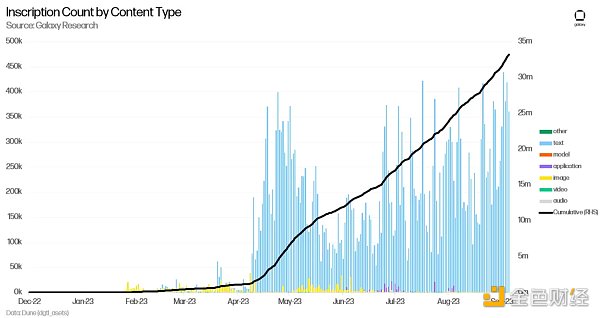 自从将任意数据写入聪的软件(称为 Ord 客户端)于 2023 年 1 月公开发布以来,支持 Ordinals 生态系统的增长和关键基础设施开发取得了令人难以置信的数量。目前共有超过 3300 万个铭文,其中文本文件是最常见的文件类型,这主要归功于 BRC-20 Token标准。