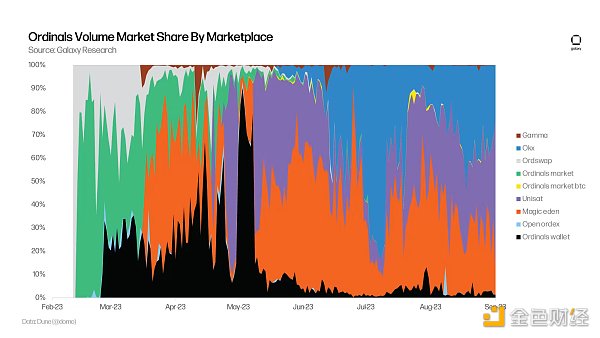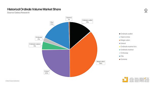 尽管 Magic Eden 和 OKX 在 Ordinals 生态系统中起步较晚,但自成立以来它们分别占 Ordinals 总量的 36% 和 25%。