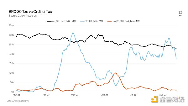对于主要铭文交易(即%20Ordinals%20交易),它们通过%20Ordinals.com%20上列出的交易%20ID%20进行识别。同一时期的所有其他交易都被归类为常规比特币交易。我们确实需要注意的是,这些常规比特币交易的一部分可能是二级市场交易,未在%20Ordinals.com%20上捕获。然而,正如%20NFT%20数据聚合器CryptoSlam所示,二次销售数量较%205%20月%208%20日的峰值大幅下降,这表明即使将其纳入其中,对费用率的影响也可能很小。