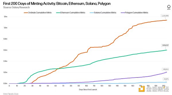 下图跟踪了每个区块链自诞生以来的前 200 天内发生的铸币数量。该图表忽略了 BRC-20 铸币厂的铭文;以下数据仅基于图像铭文。