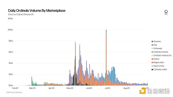 2023 年 NFT 交易量大幅下降。从 2 月到 2023 年 8 月,NFT 月度交易量连续六个月下降。2023 年 8 月是 NFT 今年表现最差的一个月,交易量达到 5 亿美元,比 2023 年 2 月下降了 4 倍。 尽管市场不利在 2023 年 NFT 的条件下,Ordinals 实现了有意义的增长。值得注意的是,Ordinals 占 5 月份所有 NFT 交易量的 18%。