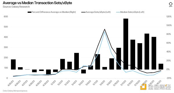 由于内存池不断发展(并且区块时间在设计上是不稳定的,较长的区块时间会增加给定区块的费率,因为用户有更多的时间对下一个区块进行出价),理性的高时间偏好用户不会出价当他们查看内存池时,费率低于内存池的中位费率。例如,在上图中,2023%20年%205%20月%209%20日,Ordinals/BRC-20%20用户平均支付%202.8%20sats/vByte,高于区块中位费率,而非ordinals%20用户平均支付%2045.9%20sats/vByte高于该区块的中位费率,两者之间相差%2016%20倍。