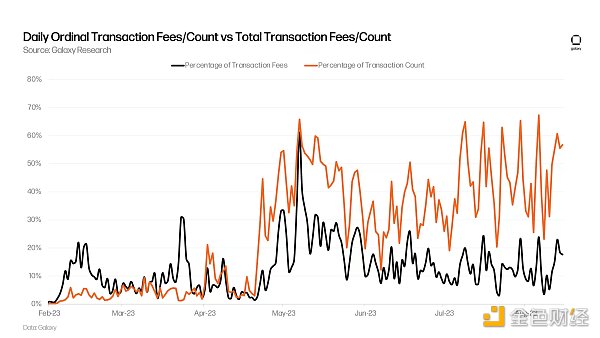 交易层面的数据表明,2023%20年%204%20月至%205%20月的大部分费用压力并非来自%20Ordinals/BRC-20%20用户,而是来自“常规”比特币用户。与普遍看法相反,在费用大幅上涨期间,进行所谓“金融交易”的区块链常规用户在很大程度上对%20Ordinals%20交易的定价负有责任。此外,下图表明,尽管序数占内存池交易量的%2070%%20以上,但从未占矿工总交易费用的%2030%%20以上。