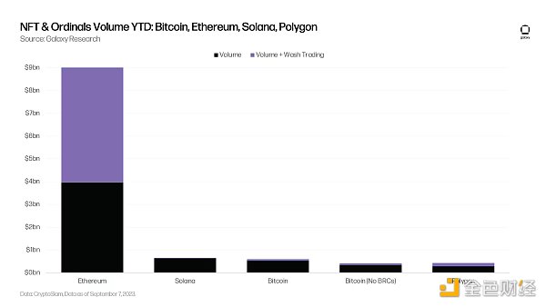 2023 年前三个季度,以太坊在 NFT 交易量中占据主导地位,超过了 Solana、比特币和 Polygon 的总和。尽管 Ordinals 在 2023 年 1 月的交易量极小,但比特币已累计网络 NFT 交易量第三高,达 5.96 亿美元。即使将 BRC-20 从比特币总序数数量中排除,比特币仍然是继以太坊和 Solana 之后第三大最受欢迎的数字收藏活动链。