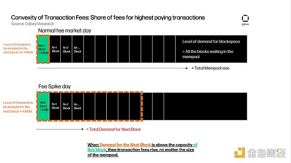 在下图中,我们通过展示当下一个区块(红色)的需求小于或等于下一个区块的容量时,费用通常不会飙升来说明这种关系。然而,当下一个区块的需求超过下一个区块的容量时,费用就会上涨。虽然这对于随意的内存池观察者来说似乎是显而易见的,但它强调了在讨论网络上交易费用的未来时的一个重要假设。只要网络能够维持对下一个区块的需求水平不超过其自然容量,对区块空间的总体需求(几乎)是无关紧要的。