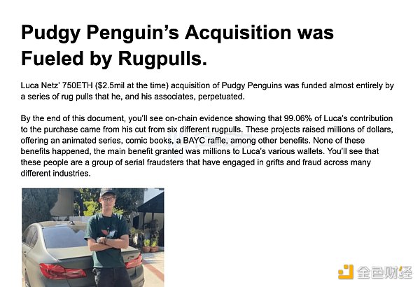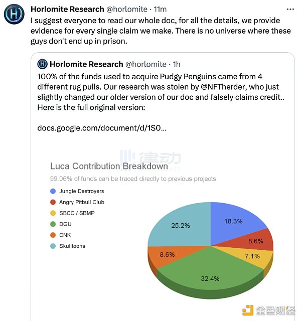 10 月 7 日,致力于「揭露加密货币和金融领域最大的欺诈行为」的 Horlomite Research 在 社交媒体 X(原推特)上连发数条动态指出,NFT 项目 Pudgy Penguins CEO Luca Netz 用于收购 Pudgy Penguins 的资金「100% 来源于 rug 四个项目而来的」,并给出了「链上证据」。