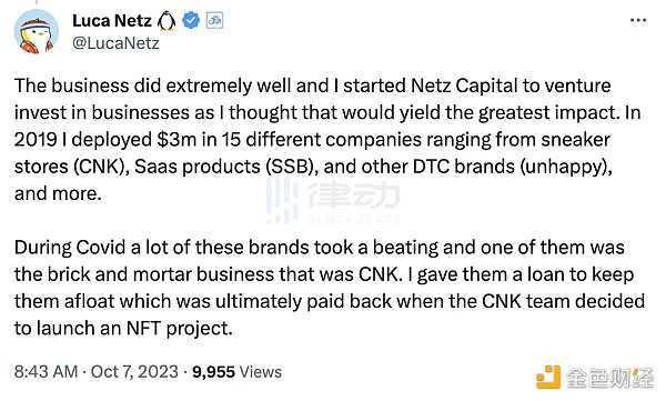 Luca 则同样连发数条动态,逐项反驳 Horlomite Research 的指责,尤其对于 rug 资金的质疑,Luca 表示:「2019 年,我在 15 家不同的公司部署了 300 万美元,包括运动鞋商店 (CNK)、Saas 产品 (SSB) 和其他品牌等。在新冠疫情期间,许多品牌都受到打击,其中之一就是 CNK 的实体业务。我给了他们一笔贷款以维持他们的生存,最终在 CNK 团队决定启动 NFT 项目时,偿还了这笔贷款。」