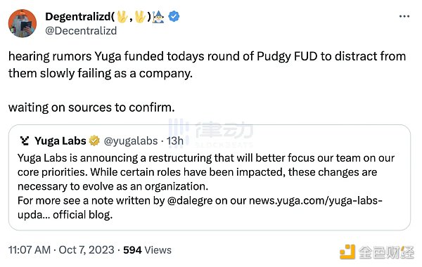 NFT 项目 DystoWassies 创始人 Decentralizd 则认为,本次 Horlomite Research 针对 Pudgy Penguins 项目创始人突如其来的指责,背后或许是同为 NFT 项目的 Yuga 希望转移舆论焦点的一次举动:「听说 Yuga 资助了今天的 Pudgy FUD 一轮融资,以分散人们对他们作为一家公司正在慢慢失败的注意力。」