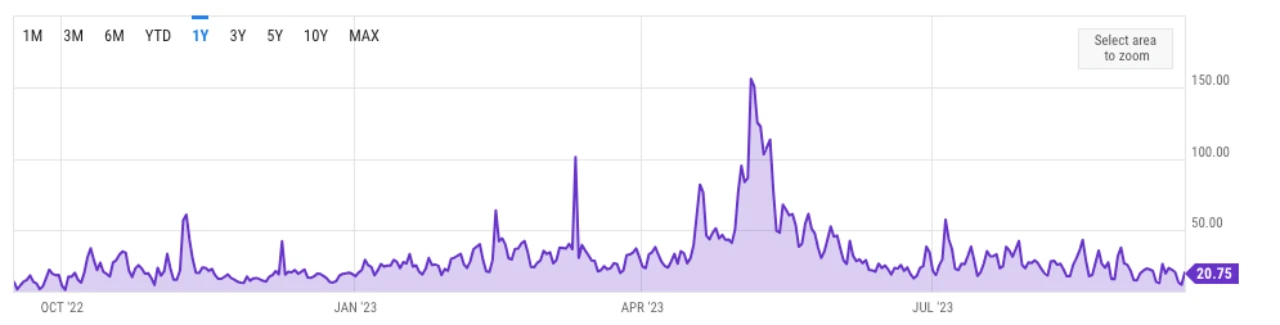 不仅如此,在 2023 年 9 月内,DEX 交易量尚未超过 30 B,尚且不如 2022 年 12 月的 40 B,更是录得 2021 年以来 DEX 单月交易量的创纪录新低——这也符合我们直观感受到的市场情绪,BTC 27, 000 美元的市场热度竟然比 16, 000 美元时更加低迷。