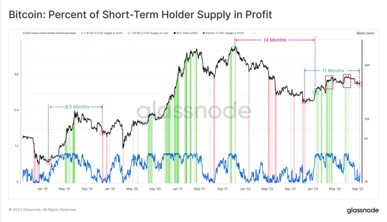 从上图可以观察到,经历将近 11 个月的市场修整,大约 97.5% 以上的短线 BTC 筹码都处于浮亏中,从$ 30, 000 一线跌到$ 25, 000 一线看似绝对跌幅并不巨大,但是割肉抛盘的痛感程度其实非常剧烈,这个级别的市场出清应该可以换来 1 个月左右的市场冷静期。