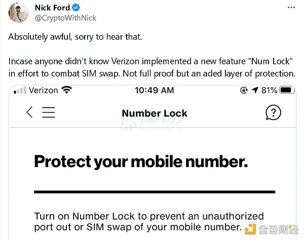 去年 1 月,Verizon 在 LinkedIn 上发布的合作伙伴经理招聘信息显示,该公司计划进军 NFT、Web 3 和元宇宙等领域。针对此次 SIM 卡交换事件,@CryptoWithNick表示,Verizon 实施了一项新功能「Num Lock」来对抗 SIM 卡交换。