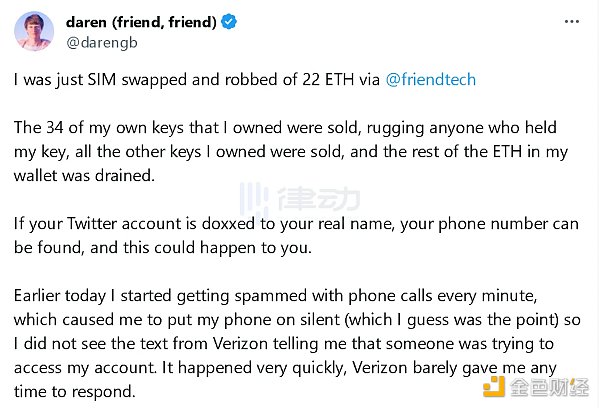 10 月 3 日,@darengb 在社交媒体平台 X(原 twitter)发文称「我刚刚被交换了 SIM 卡并被盗走了 22 ETH」。据悉,该用户在 friend.tech 上拥有的所有钥匙以及其他人账户上持有的该用户的钥匙都被卖掉了,目前该名用户钱包里剩下的 ETH 已被耗尽。「如果你的 Twitter 帐户被人肉搜索到你的真实姓名,你的电话号码就会被找到,这种情况可能会发生在你身上。」@darengb 补充道。