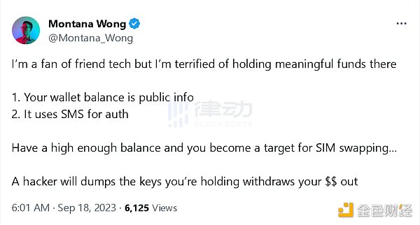 然而,早在 9 月 18 日,@Montana_Wong 就在推文中说到:「我是 friend.tech 的粉丝,但我害怕在那里持有资金。因为 1. 你的钱包余额是公开信息 2. 它使用短信进行身份验证 拥有足够高的余额,你就会成为 SIM 交换的目标……黑客会扔掉你持有的钥匙 取出你的美元。」