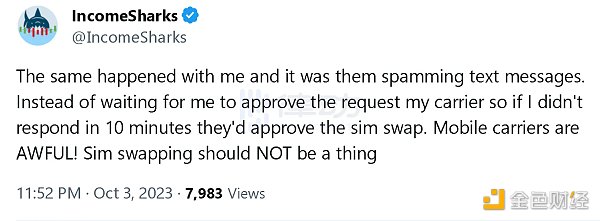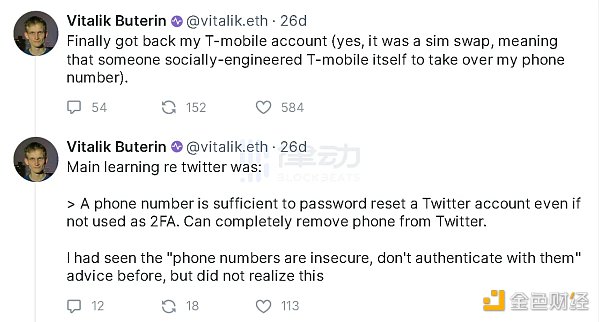 SIM 卡的调换引起损失似乎并不是新鲜事,BlockBeats 曾于 9 月 10 日报道,以太坊联创 Vitalik 的推特账号被黑客攻击并发布钓鱼链接。据 ZachXBT 表示,黑客共计盗走约 69.1 万美元。9 月 12 日,Vitalik 在社交媒体上发文表示,已经找回其 T-mobile 帐户,并确认此前的攻击是一次 SIM 卡交换攻击。