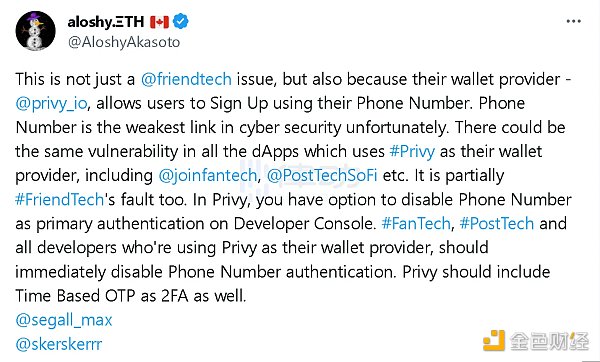 @AloshyAkasoto 对此表示,「这不仅仅是一个 friend.tech 问题,还因为他们的钱包提供商 privy 允许用户使用他们的电话号码注册。不幸的是,电话号码是网络安全中最薄弱的环节。所有使用 privy 作为钱包提供商的 dApp 中都可能存在相同的漏洞。」
