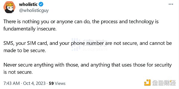 然而,社区成员仍然对此表示质疑,@wholeisticguy 发文表示,「流程和技术从根本上来说是不安全的,任何人都无法为此做出保证。短信、你的 SIM 卡和你的电话号码并不安全,也无法保证安全。永远不要用这些来保护任何东西,任何使用它们来保证安全的东西都是不安全的。」