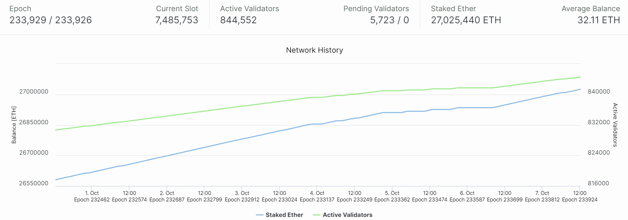 目前,以太坊共有活跃质押节点 84.4 万个,质押约 2700 万枚 ETH,质押率达到了 25.33% 。