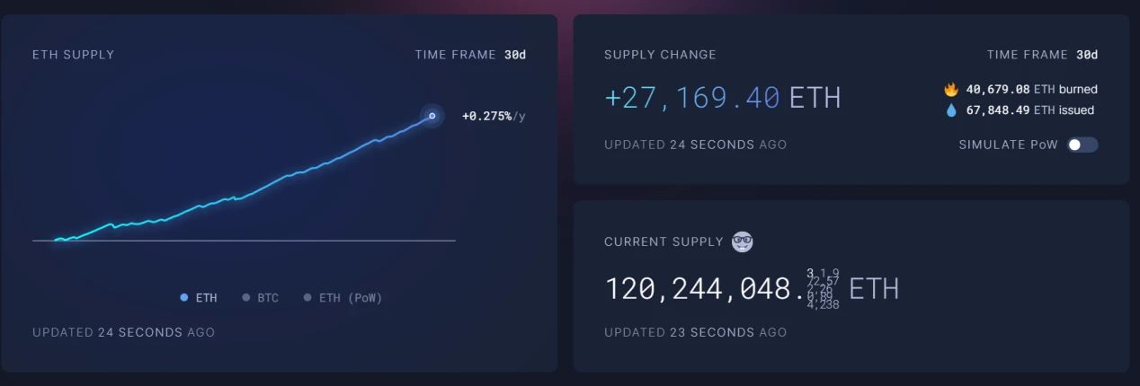 不过,整体来看,merge 之后,ETH 依然处于通缩状态,从 merge 至今,通胀率为-0.217% ,共减少了 27.7 万枚 ETH。