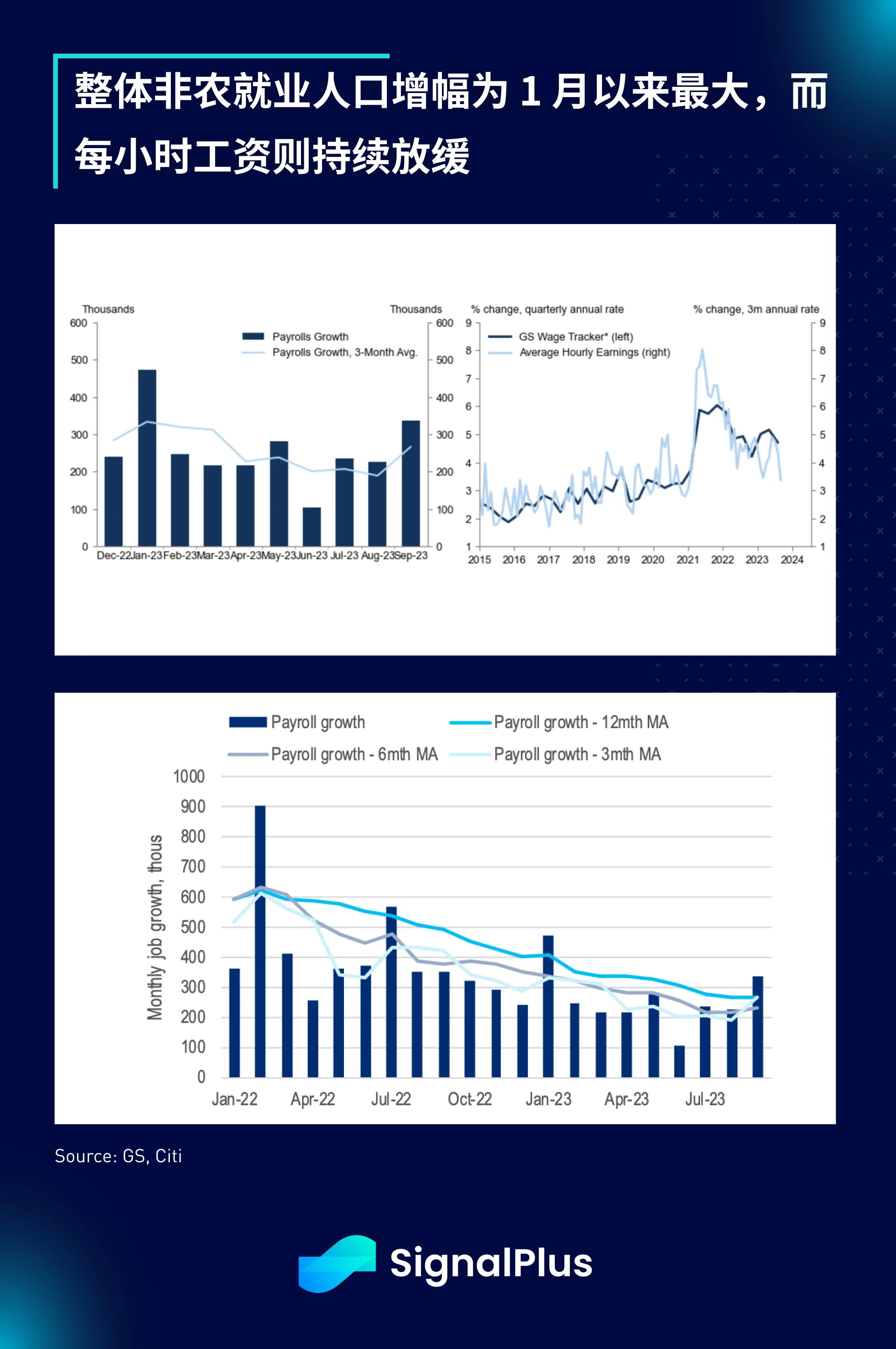上周五公布的非农就业数据显示, 9 月就业人口增加了 33.6 万人,几乎是市场预期的两倍,且是 1 月以来最大的月增幅度,前值也出现上修, 8 月份和 7 月份分别被上调至 22.7 万(+ 4 万)和 23.6 万(+ 7.9 万),整体上展现了一个强劲的就业市场情况,其中服务业最为强劲,就业人数增加了 23.4 万,其次是休闲和酒店业,增加了 9.6 万,教育和医疗保健则增加了 7 万,不过整体失业率也达到 7 个月以来的最高点 3.8% ,且每小时工资环比增长放缓至 0.2% (7 月为 0.4% ),最后,随著经济形势放缓,劳动力开始重新增加,劳动人口在 8 月激增 73.6 万人后, 9 月进一步增加了 9 万人,劳动参与率稳定保持在 62.8% 。