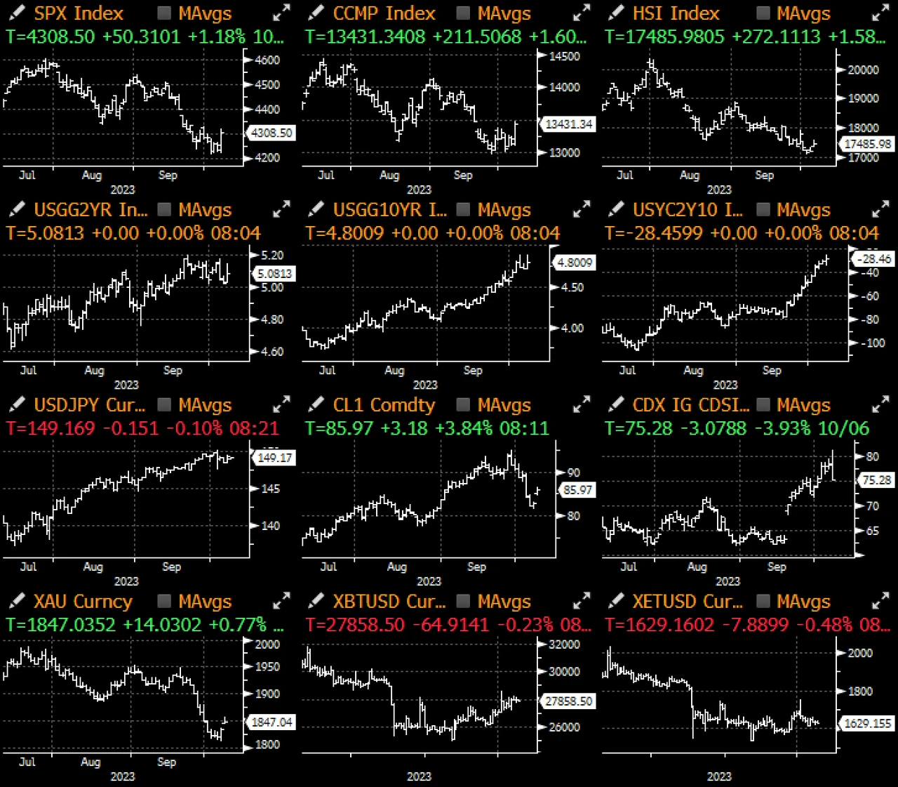 然而,市场的平静并没有持续太久,周末哈马斯组织对以色列发动了史无前例的攻击,引发了对于该地区冲突加深的担忧以及爆发另一场战争的风险,上一次类似的情况导致了 1973 年的赎罪日战争,使得原油(供应减少)和黄金(避险)价格大幅上涨,债券收益率飙升(通货膨胀),股票也相应遭到抛售,这次,市场相对更加保守,周一早上开盘时,原油/黄金/债券价格小幅上涨,股票仅下跌 0.6% ;除了冲突带来的悲剧之外,市场的主要焦点将集中在原油供应,以及当前的攻击是否会显著削弱全球近年来努力促成的中东缓和局势,我们希望冲突能够迅速降级,以尽量减少伤亡。
