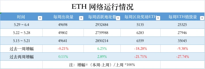 Etherscan 数据显示,过去一周以太坊网络出块量为 50080 个,环比上涨 0.1% ;每周活跃地址数为 2644663 ,环比下降 3.1% ;区块奖励收入为 2664 枚 ETH,环比上涨 10.7% ;每周 ETH 销毁量达到 7250 个,环比下降 10.9% 。