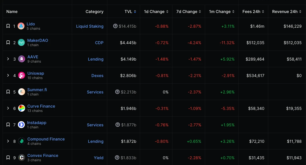 DeFiLlama 数据显示,上周链上锁仓抵押品价值从 206.3 亿美元上涨至 209.1 亿美元,环比上涨 1.3% ;从单个项目来看,锁仓价值前三名分别是: Lido 144.1 亿美元; MakerDAO 44.4 亿美元; Aave 41.4 亿美元;